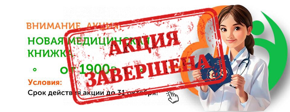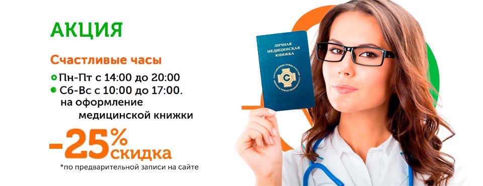 По специальному ПРОМОКОДУ действует скидка на оформление новой медицинской книжки или продления действующей в будние дни, с Пн-Пт -20%