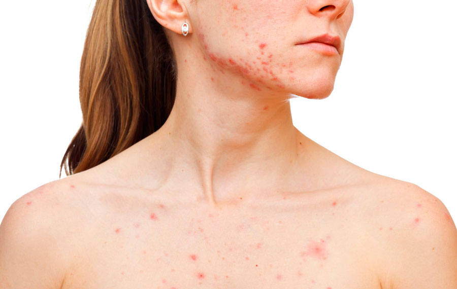 Папулезные пустулы. Сальные железы заблокированы. На поверхности образуются узелки, узелки от розового до фиолетового цвета, пустулы до 2 мм с покраснением по краям.